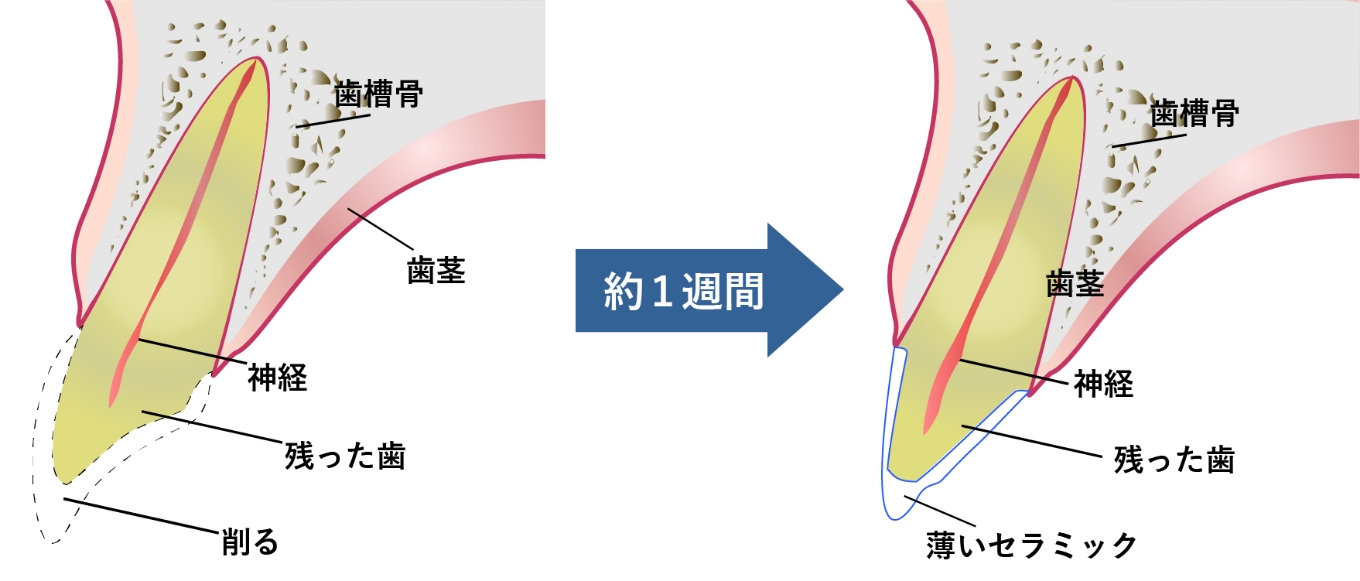 矯正治療のように数年間かけて歯並びを治していくようなことはありません。【神経を残すセラミック矯正】は最短2回の通院で治療が完了します。